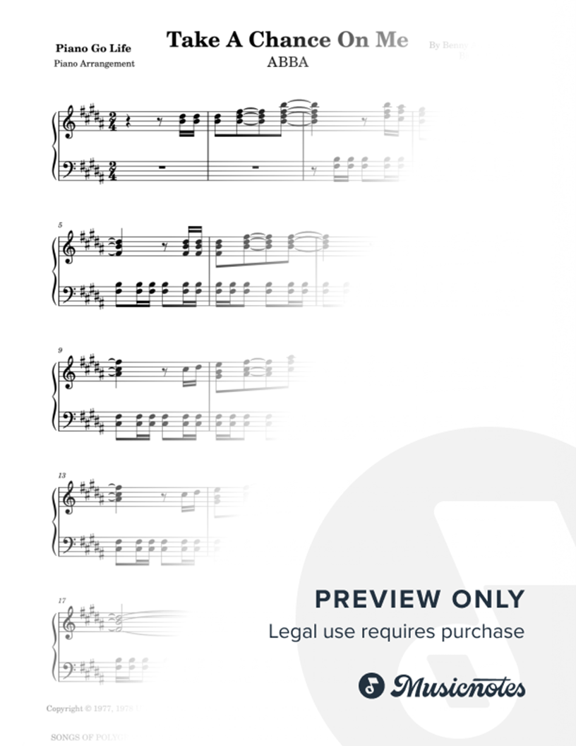 © 1977 by UNION SONGS AB (Sweden) All Rights in the U.S. and Canada Administered by EMI GROVE PARK MUSIC INC. (Publishing) and WARNER BROS. PUBLICATIONS U.S. INC. (Print) All Rights Reserved |