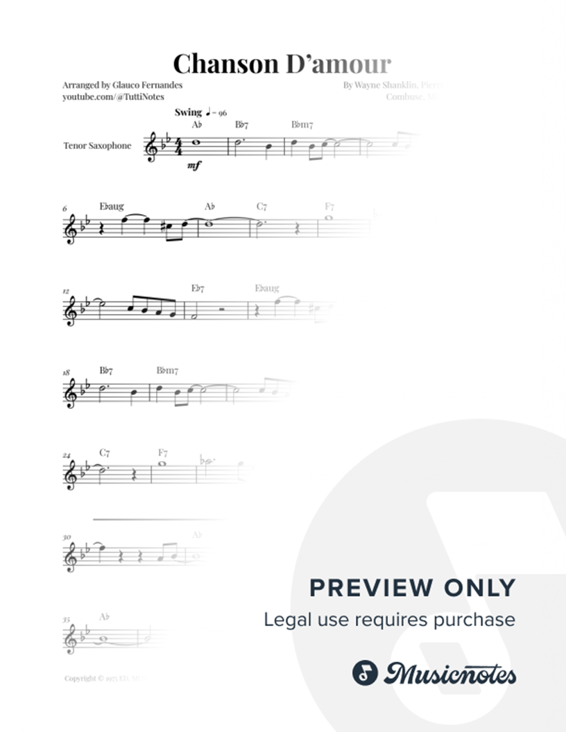 Sheet music for Chanson D'Amour arranged for Tenor Saxophone Solo. Professional layout. Clear notation. Perfect for performances. Purchase now!