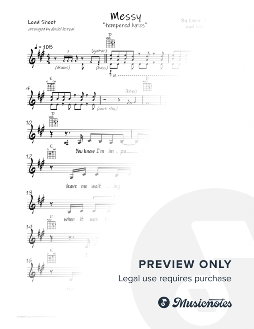 Lead Sheet Arrangement for Messy by Lola Young. Includes a large print (10 pages) and a small print (4 pages) lead sheet sketch score. Features the full vocal line for all verses with radio friendly lyrics, along with cue notes for backing vocals, guitar and keyboard riffs, and guitar diagrams.