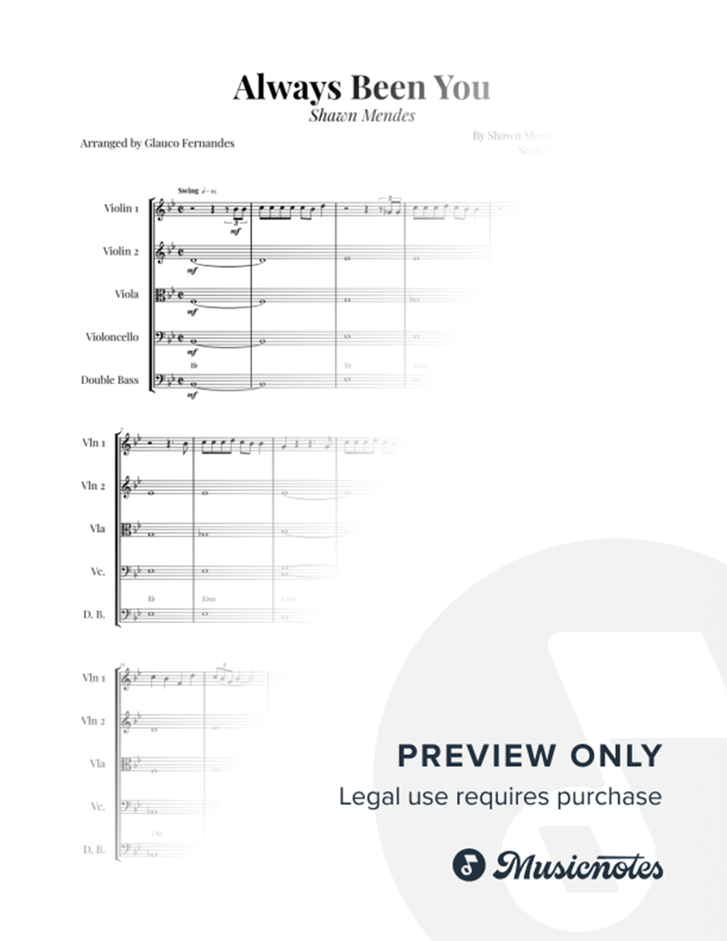 Sheet music for Shawn Mendes - Always Been You arranged for String Quintet. Includes score and individual parts. Professional layout. Clear notation. Perfect for performances. Purchase now!