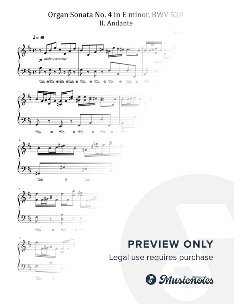Bach Organ Sonata No.4 in E minor,BWV 528 II. Andante for Piano Solo Original,Difficulty:Intermediate,Sheet Music 7Pages.