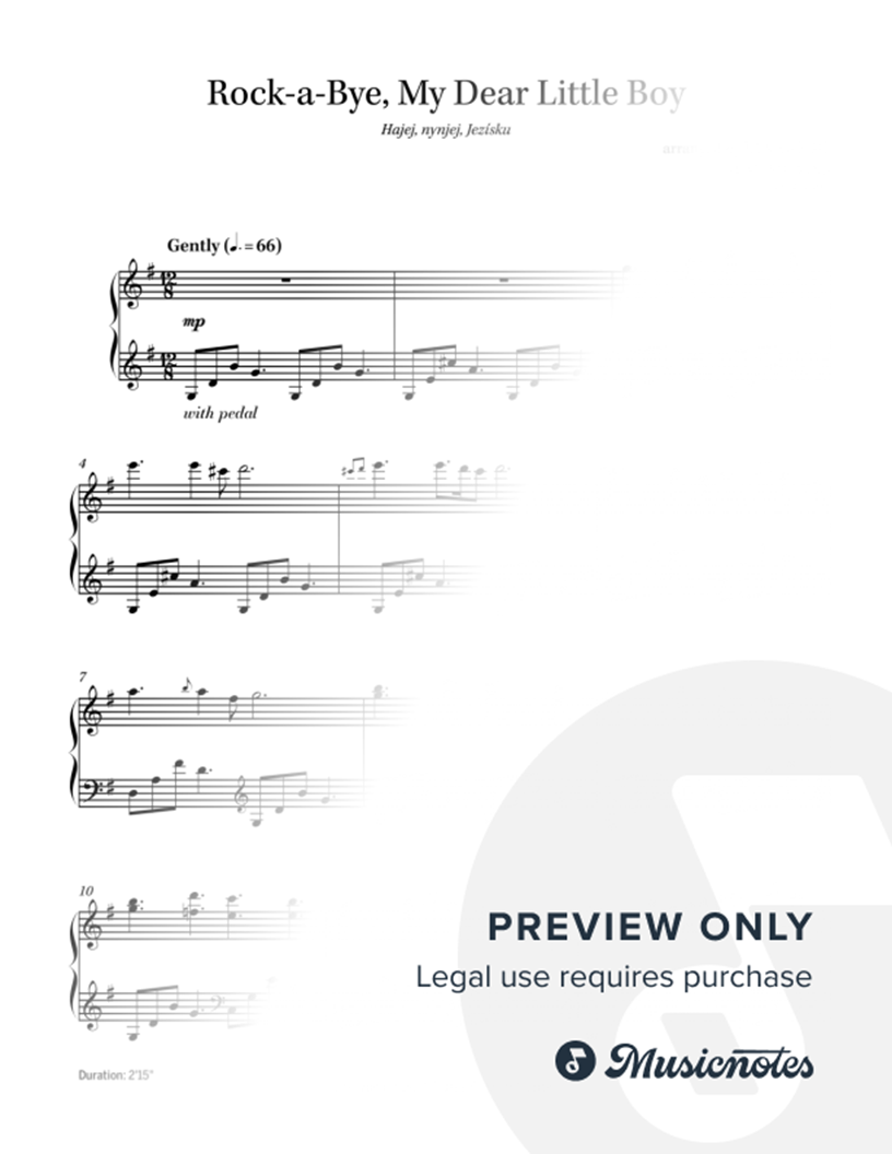 Instantly download this gently lilting solo piano arrangement of Rock-a-Bye, My Dear Little Boy in a new age style. The hymn is derived from the Czech carol "Hajej, nynjej, Jezísku." From Ian Good's Piano by Starlight series of Advent and Christmas hymn arrangements for piano.