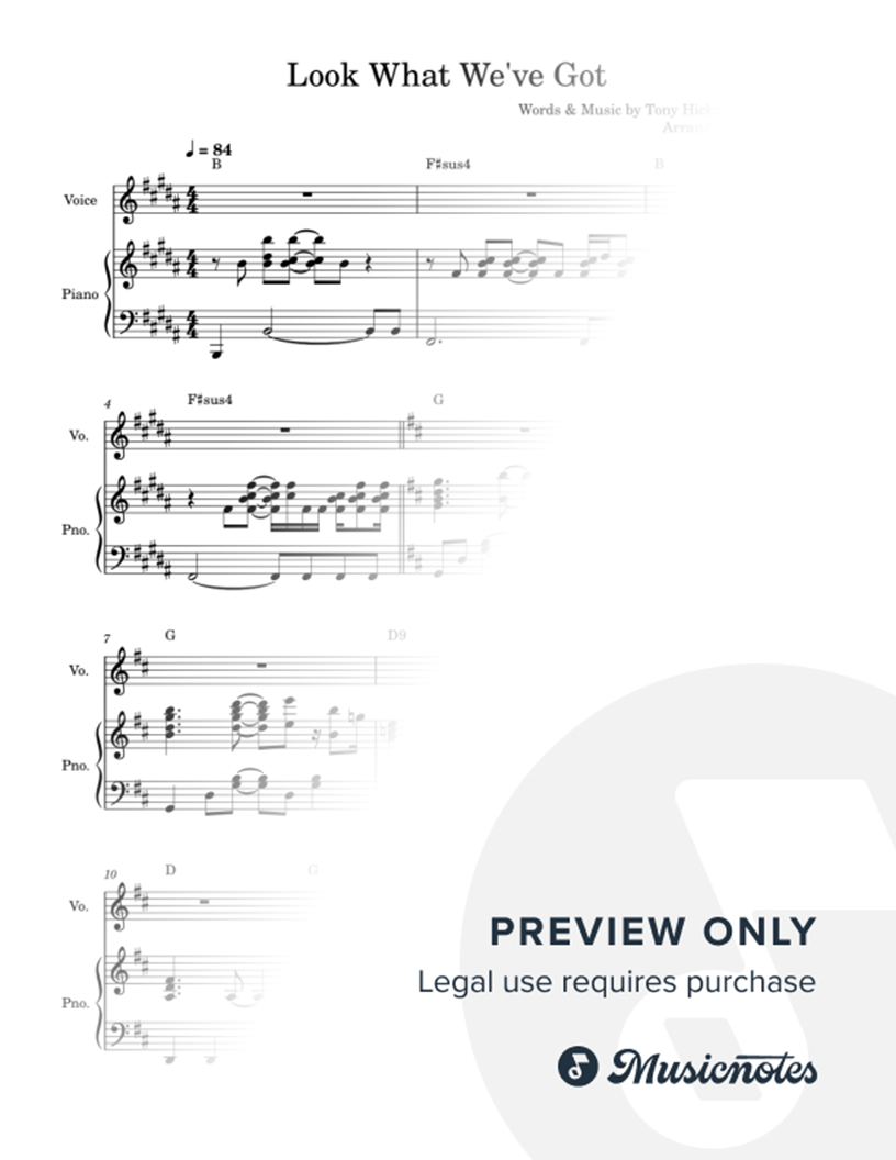 Musicnotes sells a wide variety of digital sheet music products including Singer Pros, Beginner Notes, Choral music, Piano Solos, Lead Sheets, Piano/Vocal/Guitar, Solo and Accompaniment, and fretted instrument tablature.