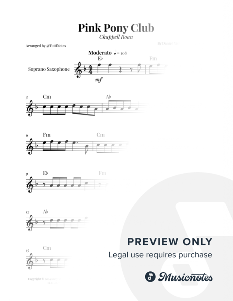 Sheet music for Pink Pony Club arranged for Soprano Saxophone Solo. Professional layout. Clear notation. Perfect for performances. Purchase now!