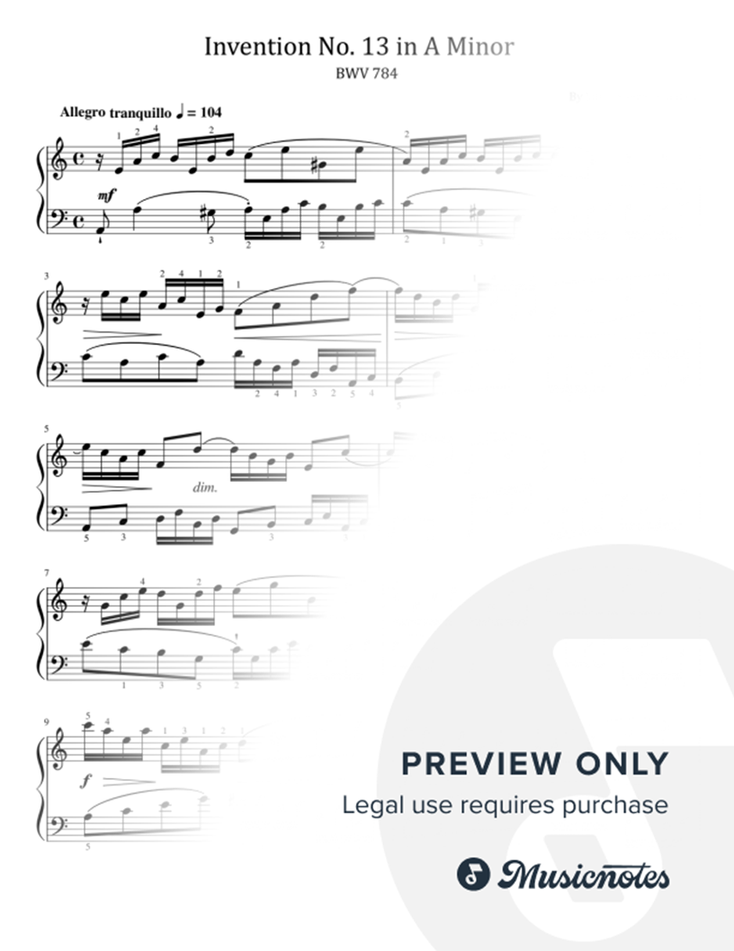 Bach,Invention No. 13 in A Minor,BWV 784,Original With Fingering |