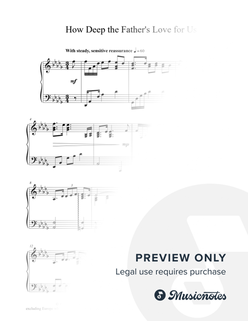 This modern hymn offers a rich, doctrinal portrayal of God's deep love for mankind through His son Jesus Christ. Be encouraged as you meditate on the lyrics as you play this arrangement of "How Deep the Father's Love for Us."