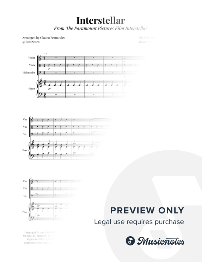 Sheet music for Interstellar - Main Theme arranged for Piano Quartet (Violin, Viola, Cello & Piano). Includes score and individual parts. Professional layout. Clear notation. Perfect for performances. Purchase now!