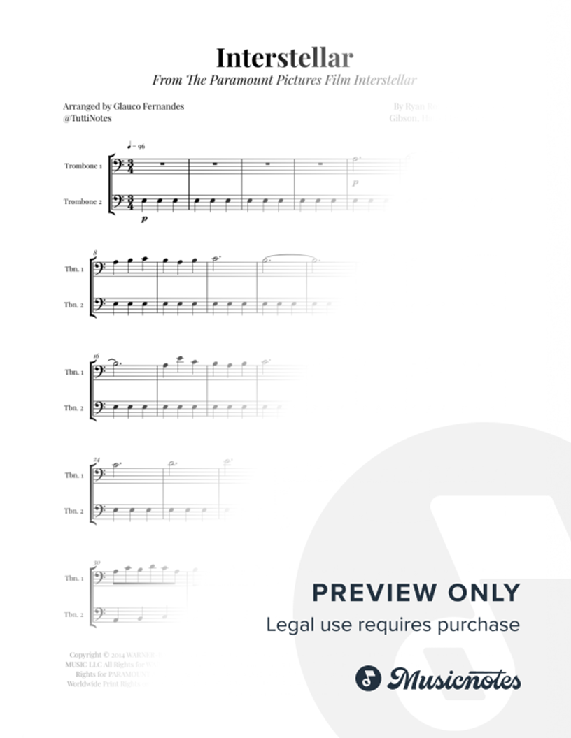 Sheet music for Interstellar - Main Theme arranged for Trombone Duet. Professional layout. Clear notation. Perfect for performances. Purchase now!