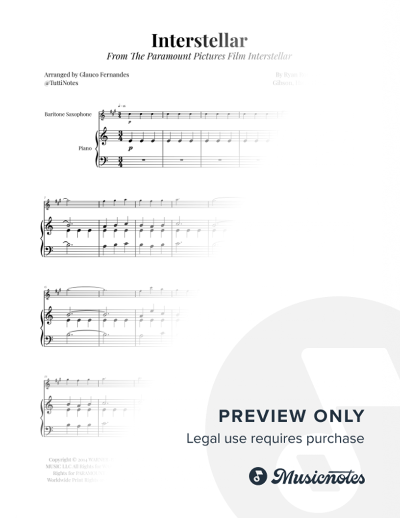 Sheet music for Interstellar - Main Theme arranged for Baritone Saxophone (High Version) and Piano. Professional layout. Clear notation. Perfect for performances. Purchase now!