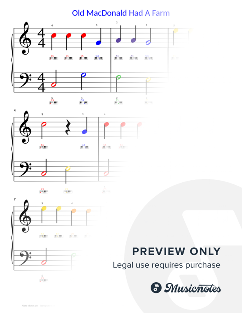 "Old MacDonald Had A Farm" - Color-coded simple piano sheet music for beginners - with app |