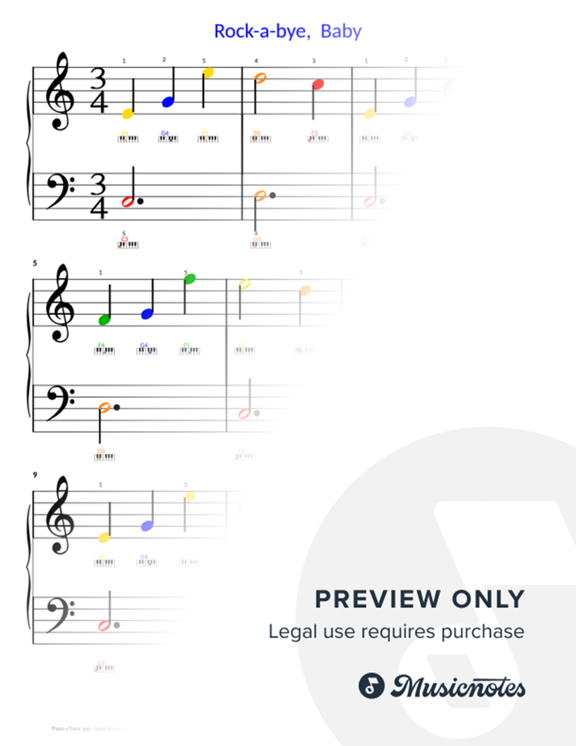 "Rock a bye, Baby" - Large-note color-coded simple piano sheet music for beginners (iOS, Android, laptop) |