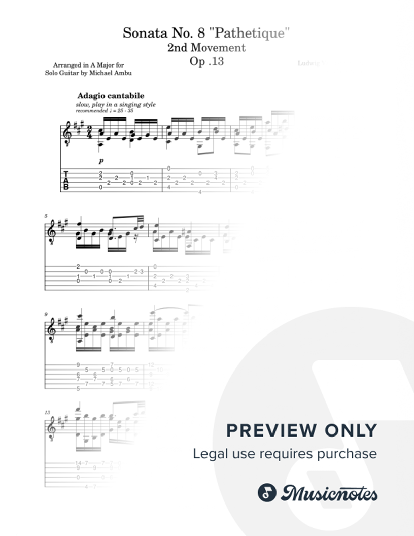 Sonata No. 8 "Pathetique" 2nd movement, arranged for solo guitar (C major) |