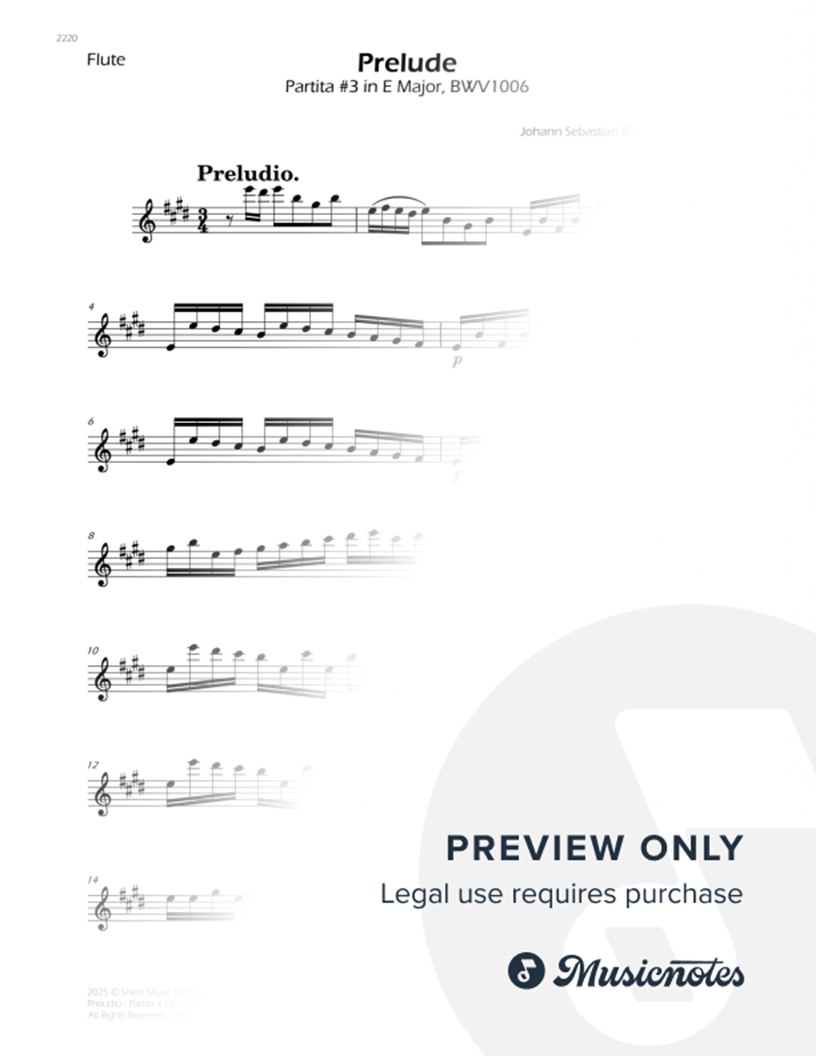 Prelude from Partita No.3 in E Major, BWV 1006 by Bach. Arrangement for Flute Solo. With Individual Flute Part. Enjoy it!