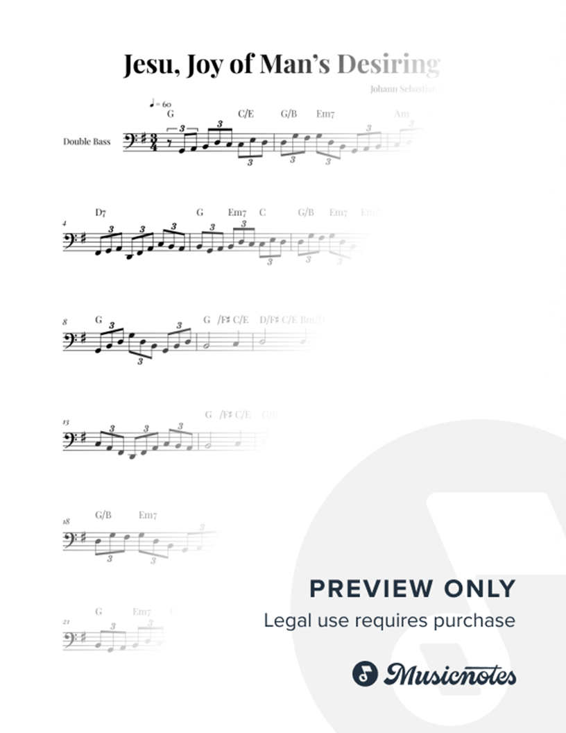 Sheet music for Jesu, Joy of Man's Desiring by Bach, arranged for Low Version Double Bass Solo, including chords. Professional layout. Clear notation. Perfect for performances. Purchase now!