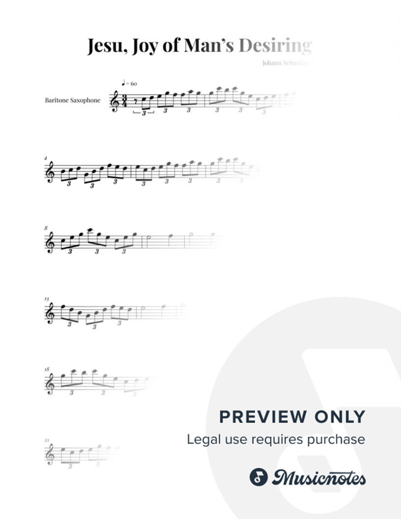 Sheet music for Jesu, Joy of Man's Desiring by Bach, arranged for Baritone Saxophone Solo. Professional layout. Clear notation. Perfect for performances. Purchase now!