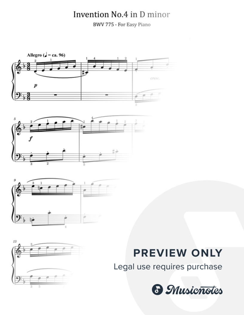 Johann Sebastian Bach, Invention No.4 in D minor, BWV 775, for Easy Piano With Fingering, Sheet Music 3 Pages.