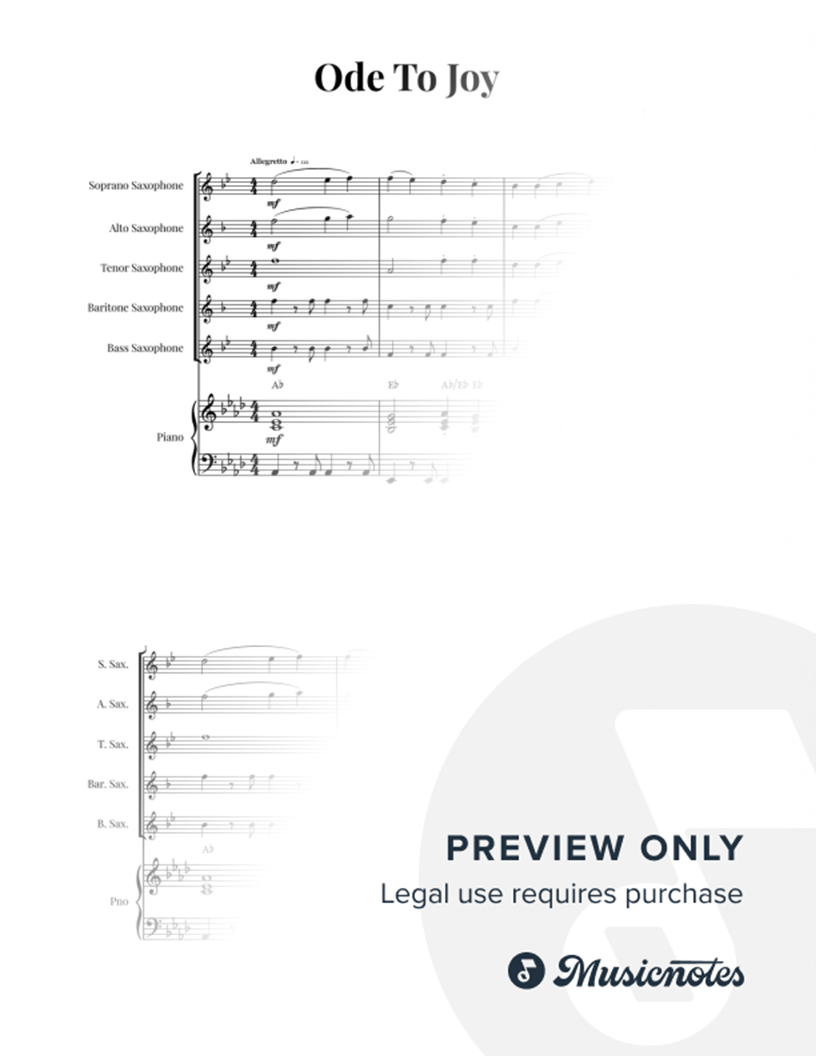 Sheet music for Ode to Joy by Beethoven, arranged for Saxophone Quintet (SATBB) and Piano (with chords). Ideal for music students, educational material, wedding ceremonies, concerts, special events.