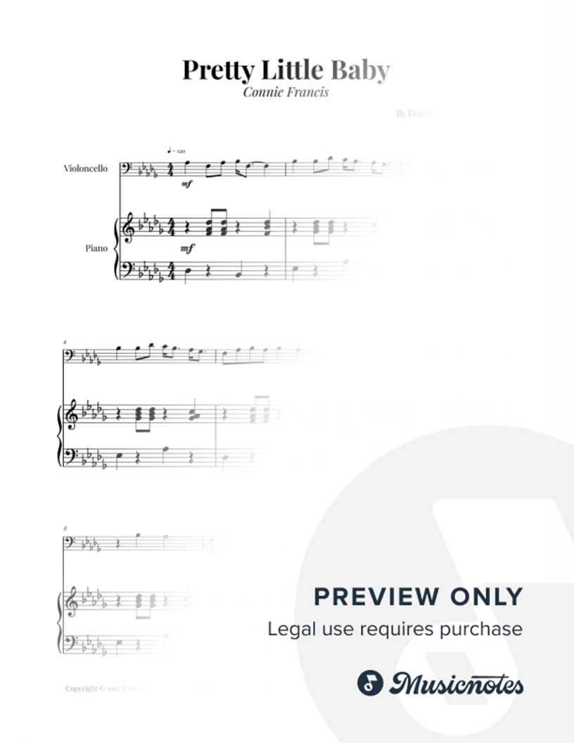 Sheet music for Pretty Little Baby by Connie Francis, arranged for Cello and Piano. Professional layout, clear notation. Ideal for music students, educational material, concerts, and special events. Get your copy!