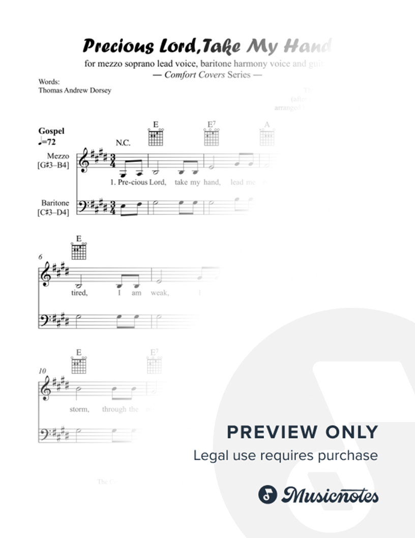 Comfort Covers are beloved songs adapted to provide bedside support in health care or hospice. Score (4 Pages) includes Mezzo-Soprano Lead Voice, Baritone Harmony Voice, Guitar Chord Diagrams, Vocal Ranges. Early Intermediate. Gospel. Capo as desired.