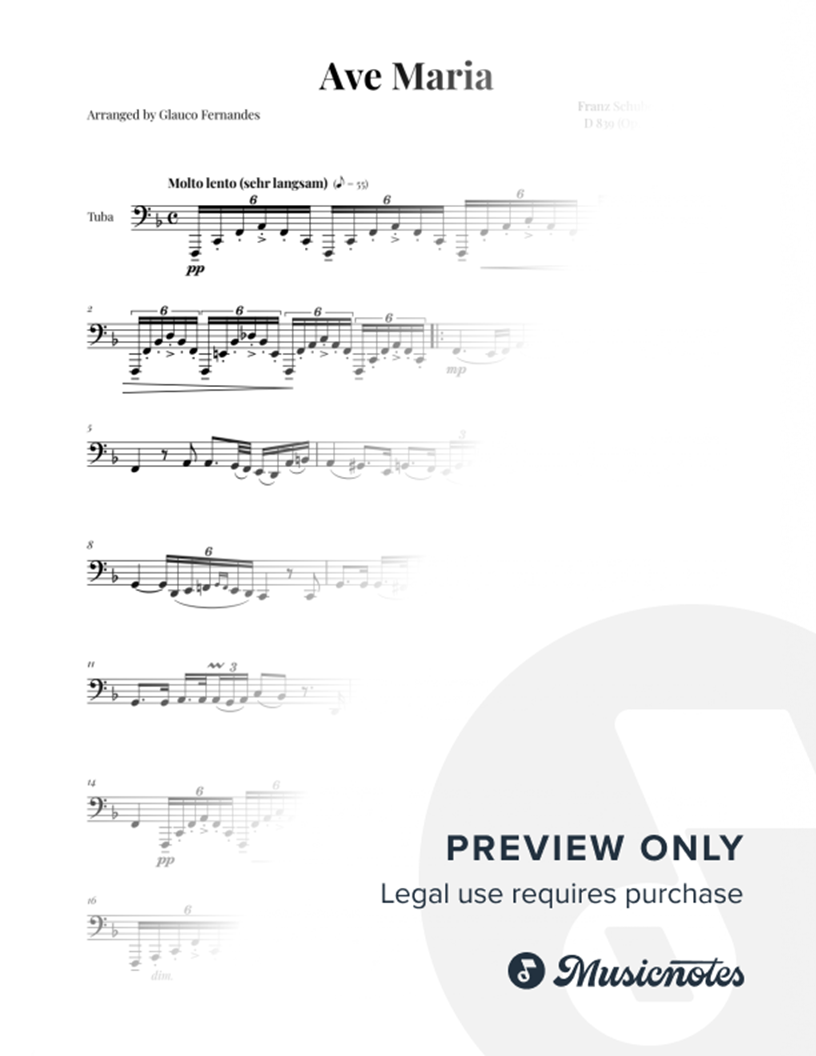 Sheet music for Ave Maria by Schubert, arranged for Tuba Solo. Includes solo part. Ideal for music students, educational material, weddings, and special events.