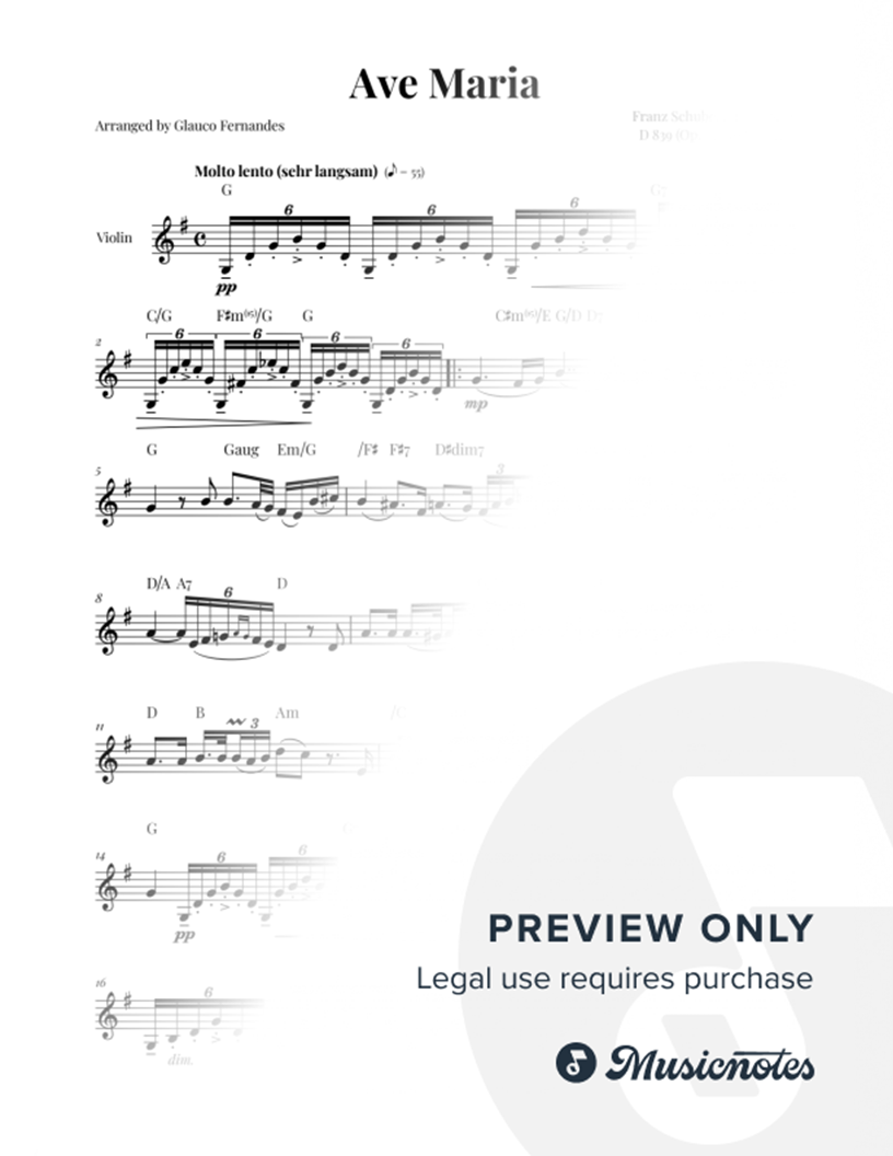 Sheet music for Ave Maria by Schubert, arranged for Violin Solo (with chords). Includes solo part. Ideal for music students, educational material, weddings, and special events.