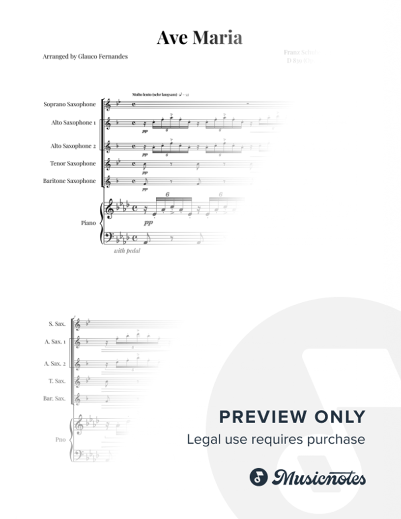 Sheet music for Ave Maria by Schubert, arranged for Saxophone Quintet (Soprano, 2 Altos, Tenor, Baritone) with Piano. Includes score and individual parts. Ideal for music students, educational material, and events.