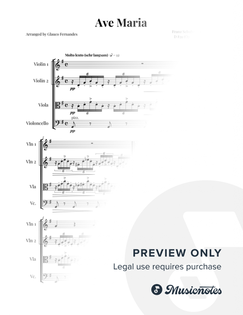 Sheet music for Ave Maria by Schubert, arranged for String Quartet. Includes score and individual parts. Ideal for music students, educational material, weddings, concerts, and special events.