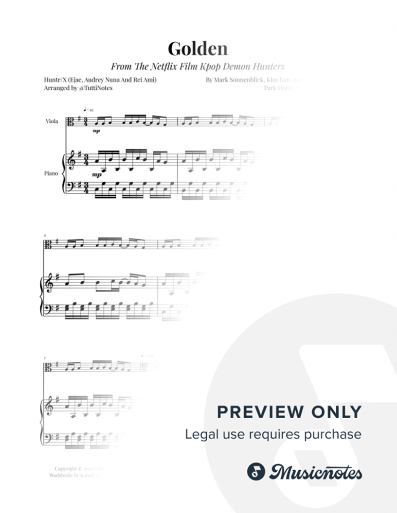 Sheet music for Golden, arranged for Viola and Piano. Includes score and solo part. Ideal for music students, educational material, concerts, and special events. Get your copy now!