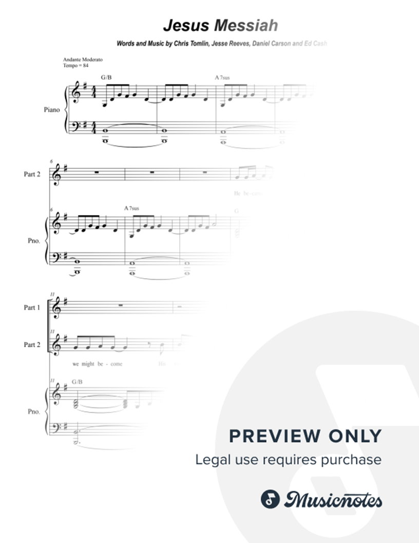 One of the most well-known songs by Contemporary Christian music artist - Chris Tomlin, has now been freshly arranged for a 2-part choir (Part 1: High Voices (Sop. & Ten), Part 2: Low Voices (Alto & Bass) with Piano accompaniment. Price includes a 5-copy limit print license.
