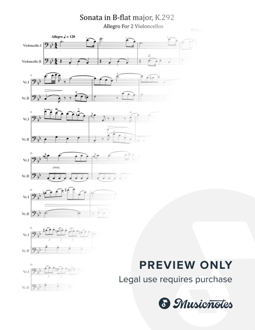 Mozart, Sonata in B-flat major, K.292 I.Allegro, for 2 Cellos Original Score and Parts |