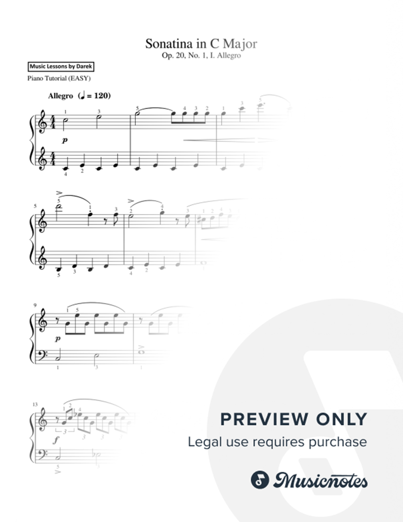 Sonatina in C Major, Op. 20, No. 1, I. Allegro [Friedrich Kuhlau] - Easy Piano |