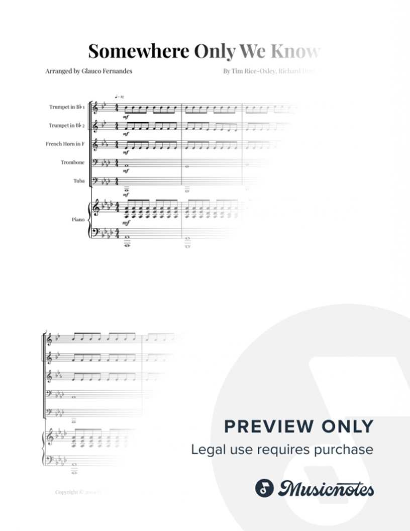 Somewhere Only We Know - Keane | BRASS QUINTET & PIANO Sheet music for Somewhere Only We Know, arranged for Brass Quintet (2 Trumpets, French Horn, Trombone, Tuba) and Piano. Includes score and individual parts. Ideal for music students, educational material, concerts, and special events.