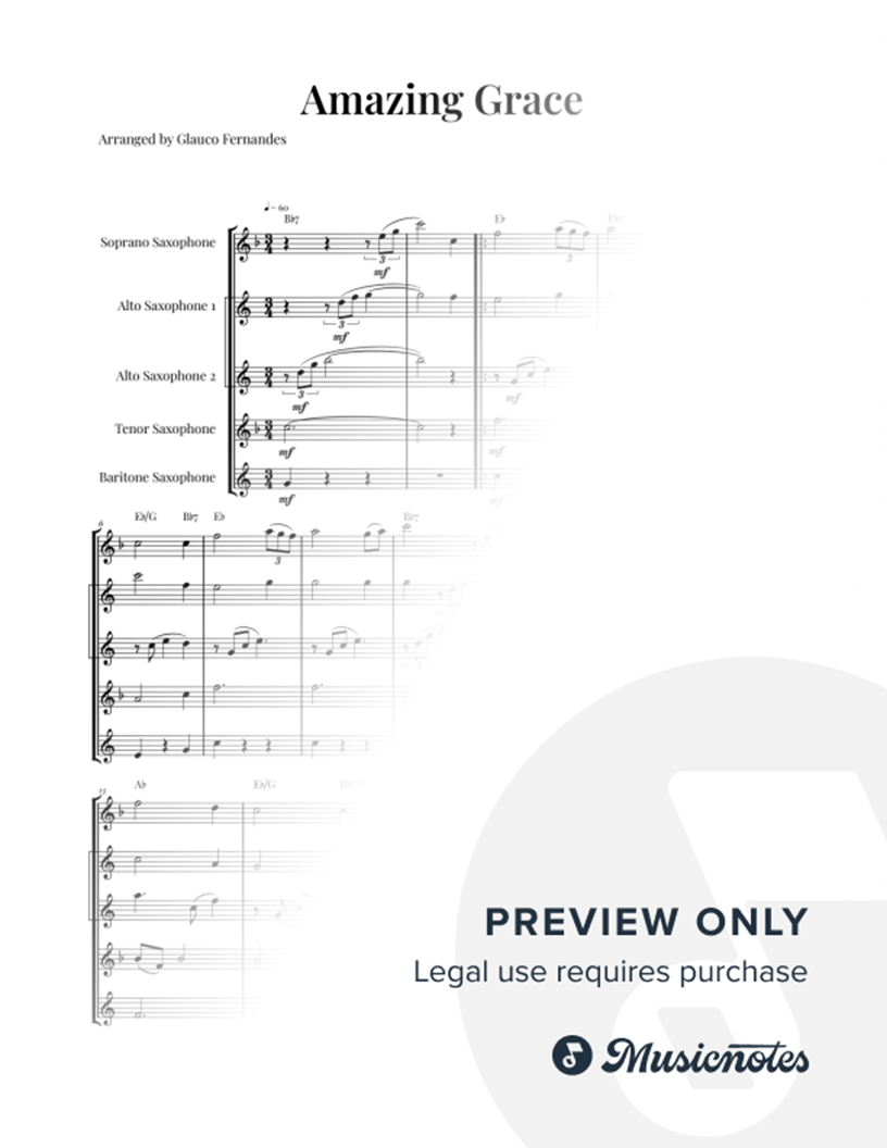 Amazing Grace | SAX QUINTET (SAATB) (with Chords) Sheet music for Amazing Grace, arranged for Saxophone Quintet (Soprano, 2 Altos, Tenor, Baritone) (with chords). It includes score and individual parts. This arrangement is ideal for church services, weddings, and concerts.