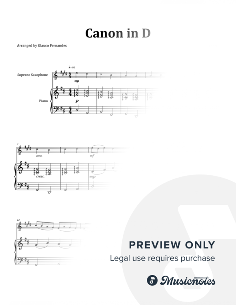 Pachelbel's Canon | SOPRANO SAX & PIANO Sheet music for Pachelbel's Canon, arranged for Soprano Saxophone and Piano. This arrangement includes score and solo part, ideal for music students, educational material, and special events.