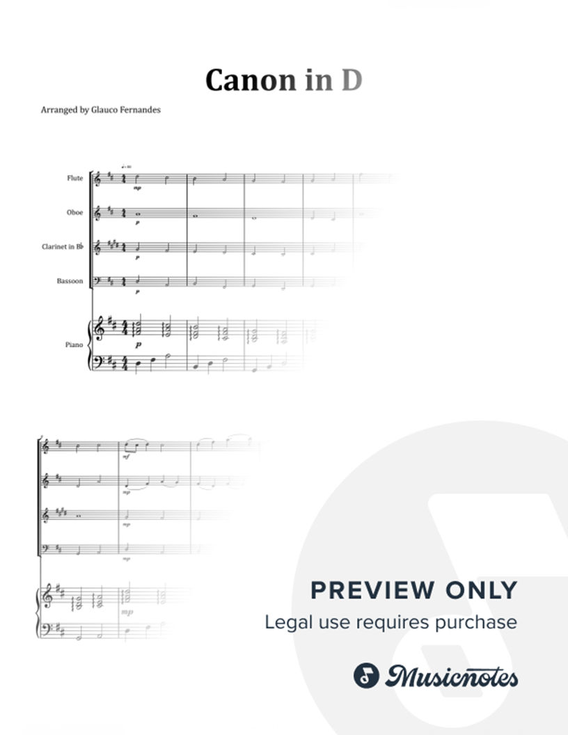 Pachelbel's Canon in D | WOODWIND QUARTET with PIANO Sheet music for Pachelbel's Canon in D, arranged for Woodwind Quartet (Flute, Oboe, Clarinet, and Bassoon) with Piano. It includes score and individual parts, ideal for music students, educational material, and special events.