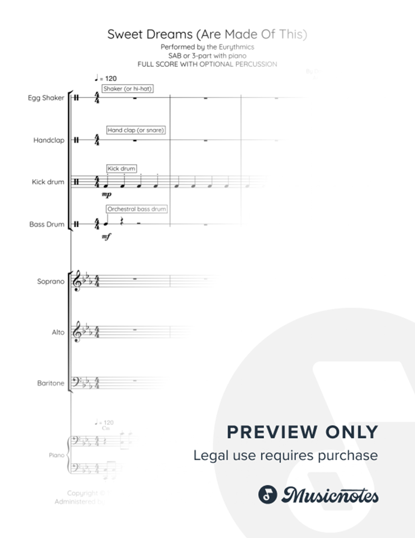 Sweet Dreams (Are Made of This) – Percussion Parts & Score for SAB Choir Arrangement | Eurythmics |