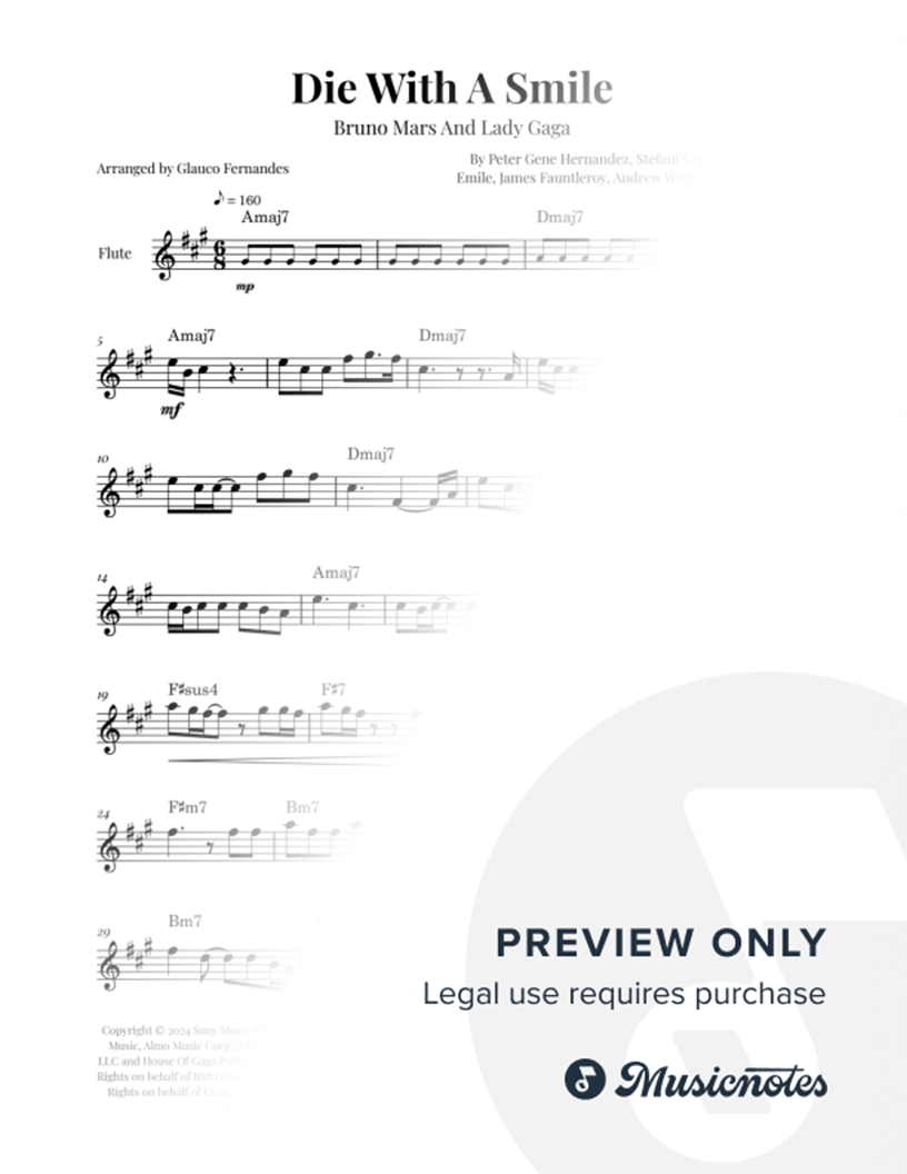 Die With A Smile - Bruno Mars And Lady Gaga | FLUTE SOLO (with Chords) Sheet music for the new hit Die With A Smile by Bruno Mars and Lady Gaga, arranged for FLUTE SOLO (with chords). It includes the solo part, perfect for music students, pop music fans, and special events.
