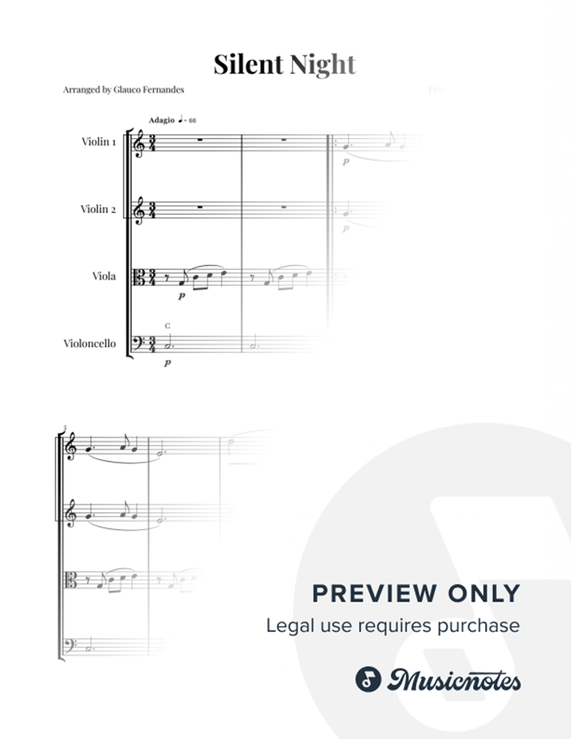 Silent Night | STRING QUARTET (with Chords) Sheet music for the timeless carol Silent Night, arranged for STRING QUARTET (2 Violins, Viola, and Cello) with chords. Includes full score and individual parts, ideal for holiday concerts, church services, and festive events.
