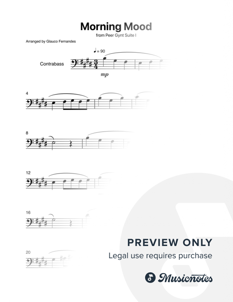 Morning Mood | DOUBLE BASS Sheet music for the beautiful classic Morning Mood from Peer Gynt Suite by GRIEG, arranged for DOUBLE BASS. Includes the INSTRUMENT PART, perfect for MUSIC STUDENTS, EDUCATIONAL MATERIAL, and CONCERTS.