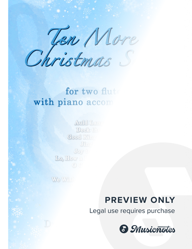 Duet arrangements of the following ten Christmas songs for two Flutes with Piano accompaniment: Auld Lang Syne Deck the Halls Good King Wenceslas Jingle Bells Joy to the World Lo, How a Rose E'er Blooming O Christmas Tree O Holy Night We Wish You a Merry Christmas What Child is This