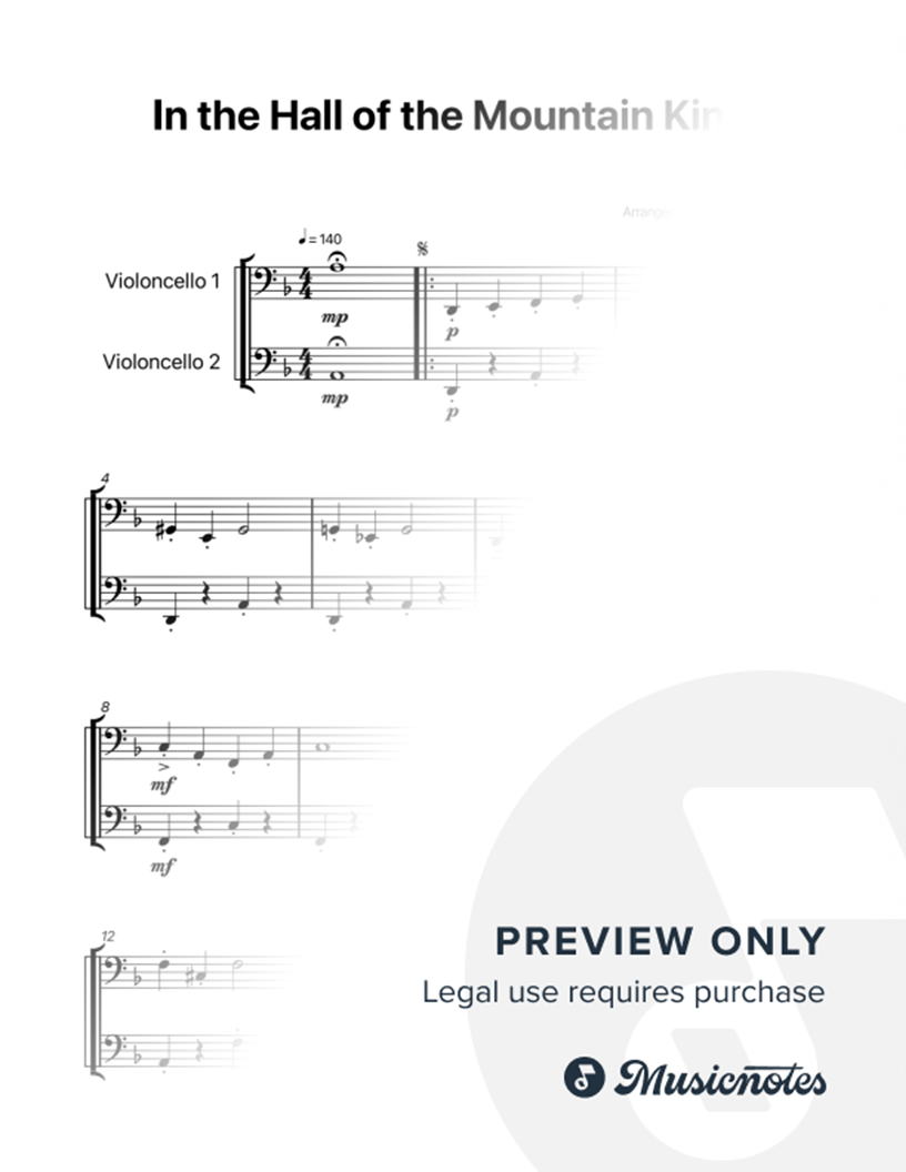 In the Hall of the Mountain King | CELLO DUET Sheet music for the iconic classic from Grieg's Peer Gynt Suite, arranged for CELLO DUET. This version is simplified for an easy play. Includes full score and individual parts. Perfect for educational material and festive events.