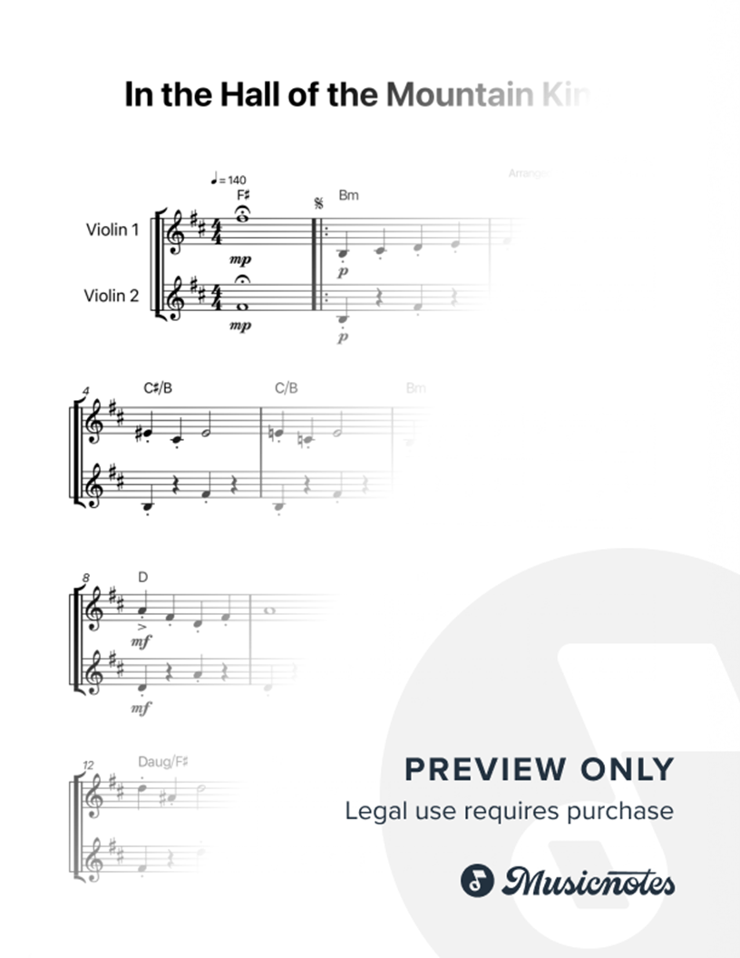 In the Hall of the Mountain King | VIOLIN DUET (with Chords) Sheet music for the iconic classic from Grieg's Peer Gynt Suite, arranged for VIOLIN DUET (with chords). This version is simplified for an easy play. Includes full score and individual parts. Ideal for students and concerts.