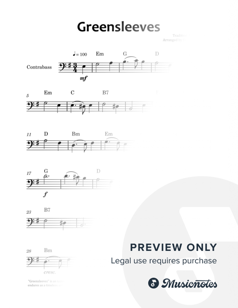 Greensleeves | DOUBLE BASS SOLO (with Chords) Sheet music for the traditional air Greensleeves, arranged for DOUBLE BASS SOLO (with chords). Includes the INSTRUMENT PART. Ideal for wedding ceremonies, church services, and formal events.