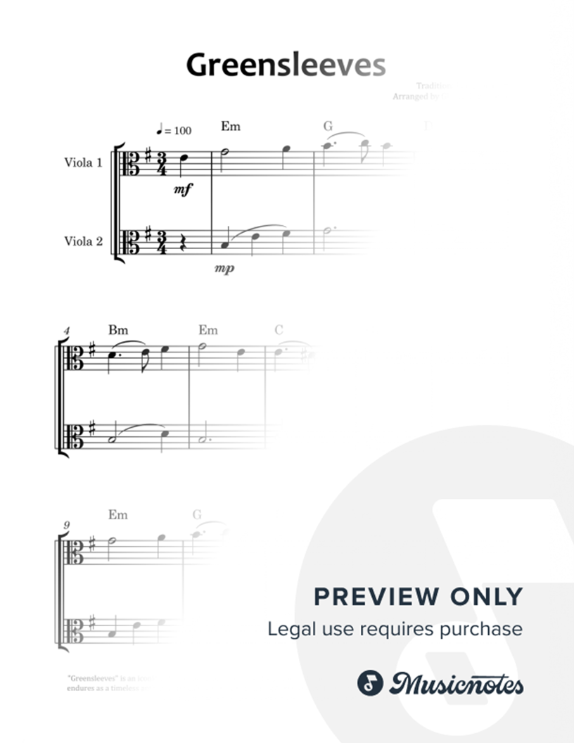 Greensleeves | VIOLA DUET (with Chords) Sheet music for the traditional air Greensleeves, arranged for VIOLA DUET (with chords). Includes full score and individual parts. Ideal for wedding ceremonies, church services, and formal events.