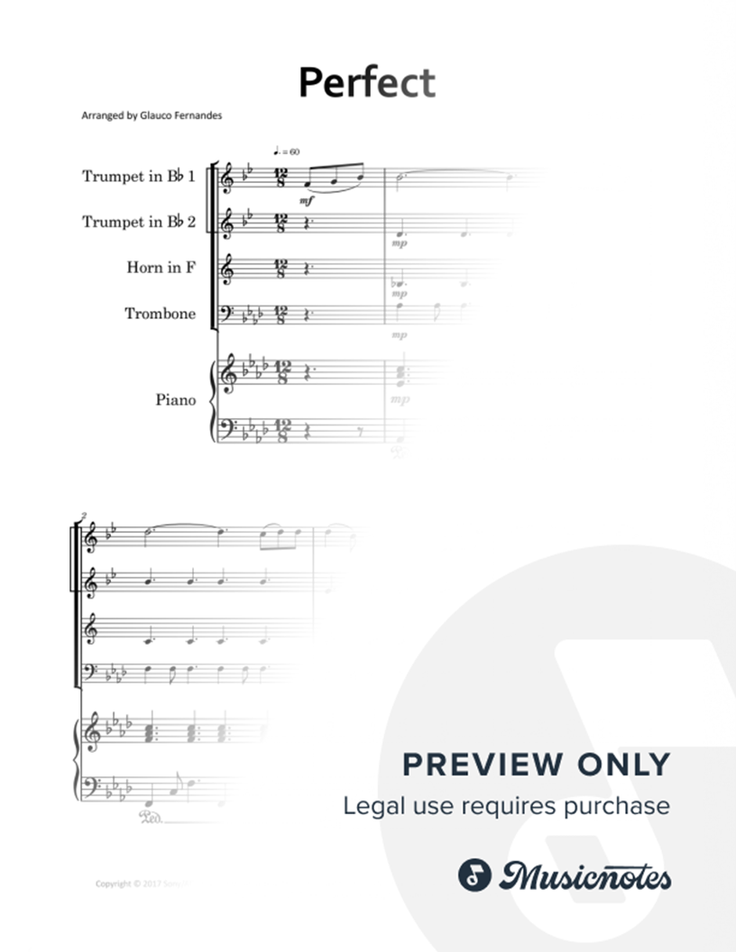 Perfect - Ed Sheeran | BRASS QUARTET and PIANO Sheet music for Perfect by Ed Sheeran, arranged for BRASS QUARTET (2 Bb TRUMPETS, FRENCH HORN, TROMBONE) and PIANO. Includes full score and individual parts. Perfect for music students, ensemble performance, and wedding ceremonies.