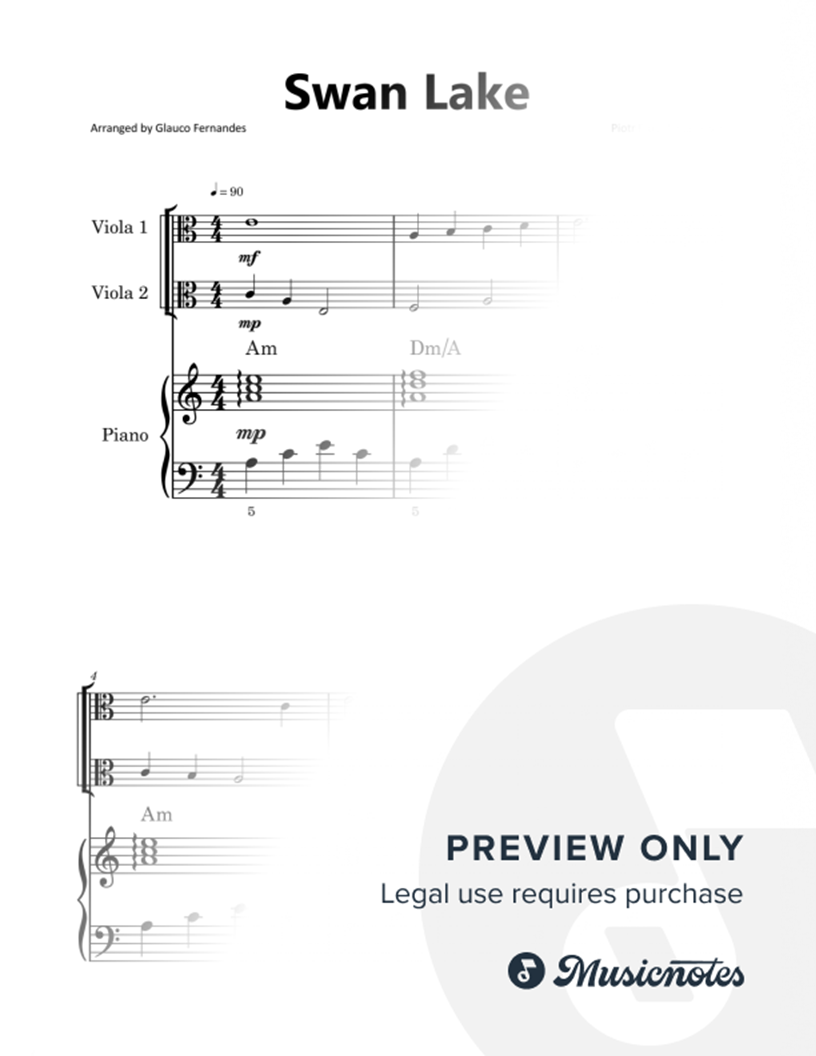 Swan Lake Theme - Tchaikovsky | EASY VIOLA DUET and PIANO (with Chords) Sheet music for the iconic Swan Lake Theme by TCHAIKOVSKY, arranged for EASY VIOLA DUET and PIANO (with chords). Includes full score and individual parts. Perfect for BEGINNERS, students, and concerts.