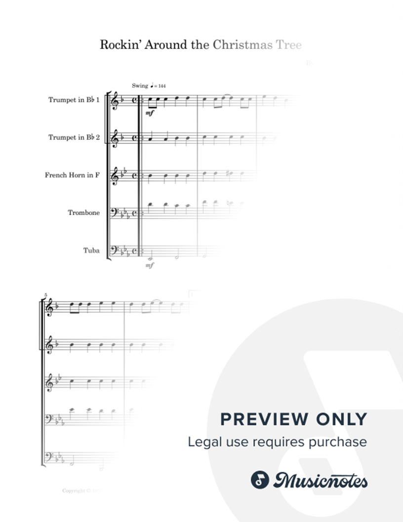 Rockin' Around The Christmas Tree | BRASS QUINTET (Score & Parts) Sheet music for BRASS QUINTET (2 Trumpets, French Horn, Trombone, and Tuba). EASY arrangement of the popular CHRISTMAS song Rockin' Around The Christmas Tree. Includes score and parts.