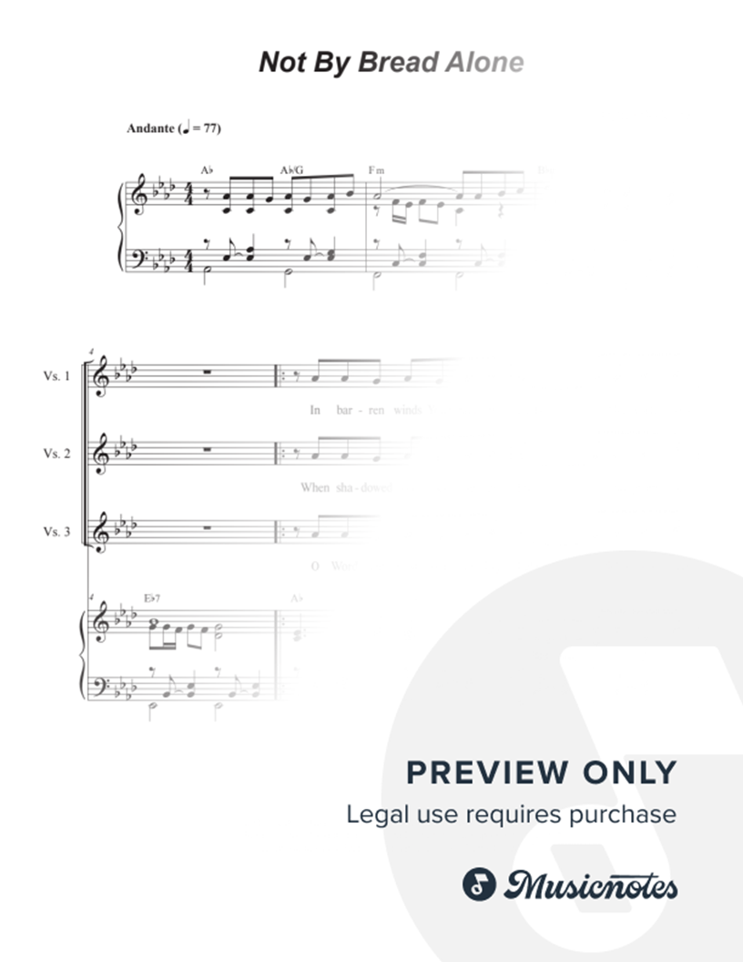 "Not By Bread Alone" is a contemplative hymn based on Matthew 4:4, reflecting the mystery of Christ’s temptation in the desert and the soul’s hunger for the Word of God. Price includes a 5-copy limit print license.