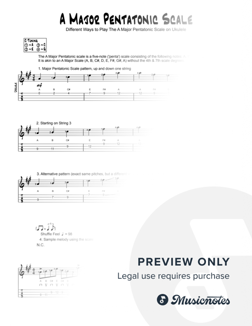 This sheet shows ukulele players 3 different ways to play the A Major Pentatonic scale. Plus a 4-bar original composition demonstrating how to apply the scale in a musical context. In standard notation and TAB, with note names and fingering written into score.