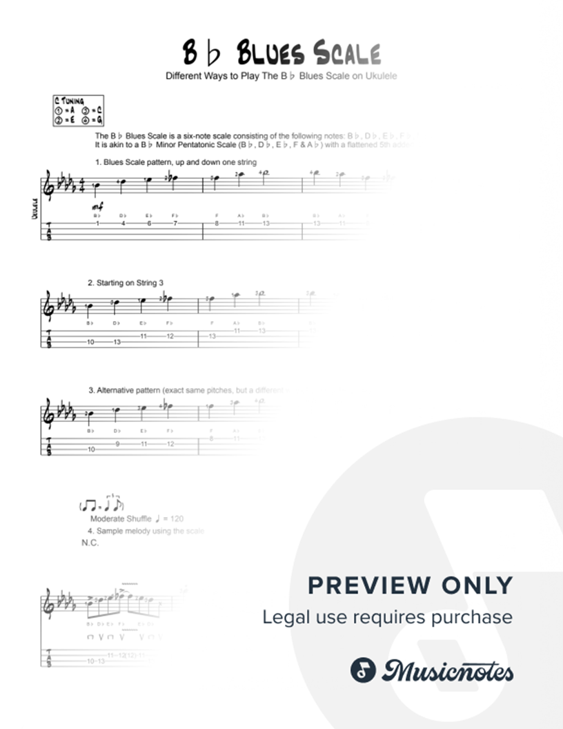 This sheet shows ukulele players 3 different ways to play the Bb Blues scale. Plus a 4-bar original composition demonstrating how to apply the scale in a musical context. In standard notation and TAB, with note names and fingering written into score.